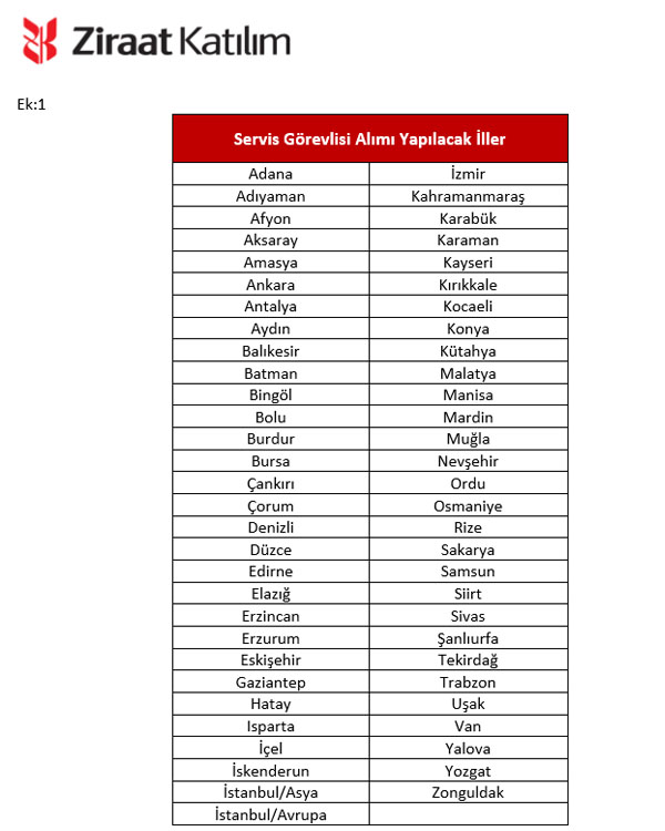 Servis Görevlisi adayı, Bankamızca açılacak il veya ilçe şubelerinde yerel personel olarak istihdam edilecek olup, ilan edilen illerde (Ek:1) ve bağlı ilçelerinde ikamet eden adaylar tercih nedeni olacaktır, (Mülakat sırasında adayın başvurduğu ilde yaşamını sürdürdüğüne dair gerekli araştırma yapılacaktır.)